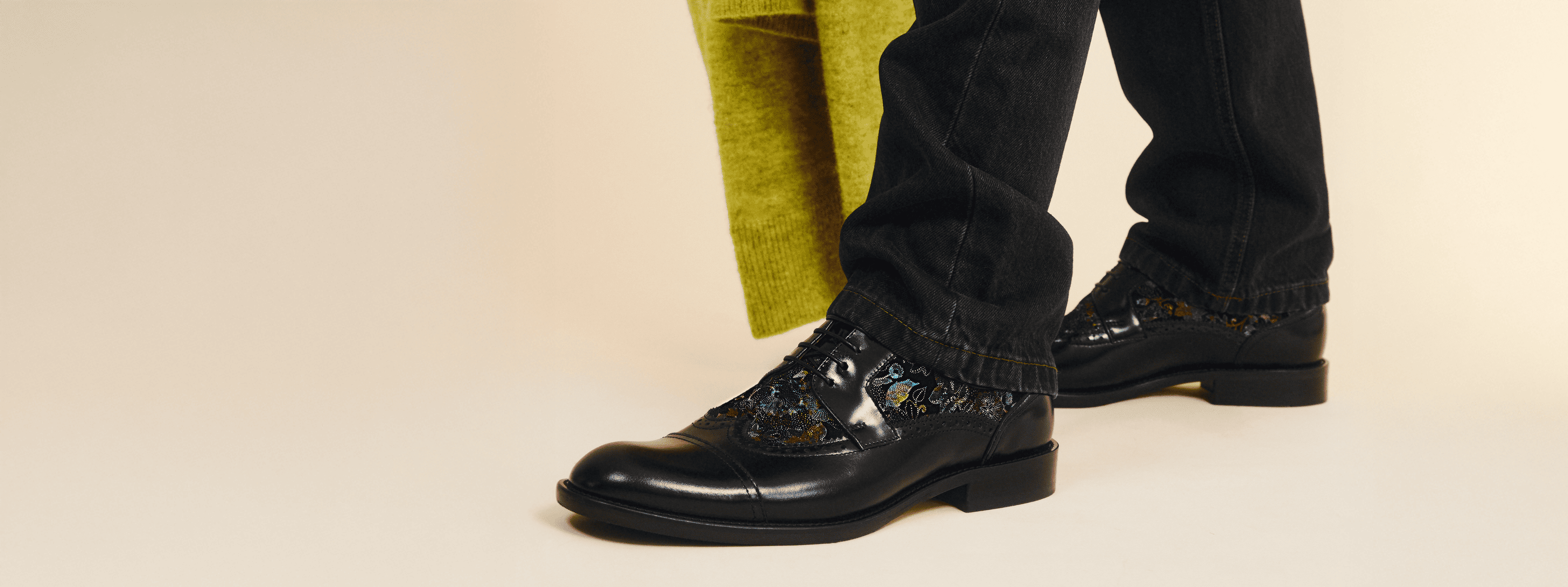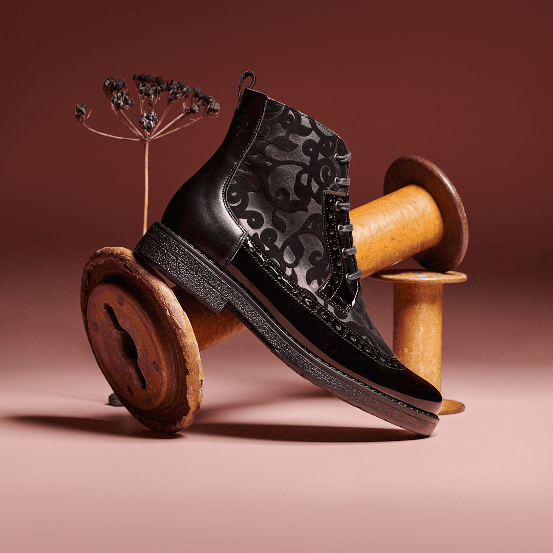Men's toe cap dressy black shoe with flower print leather