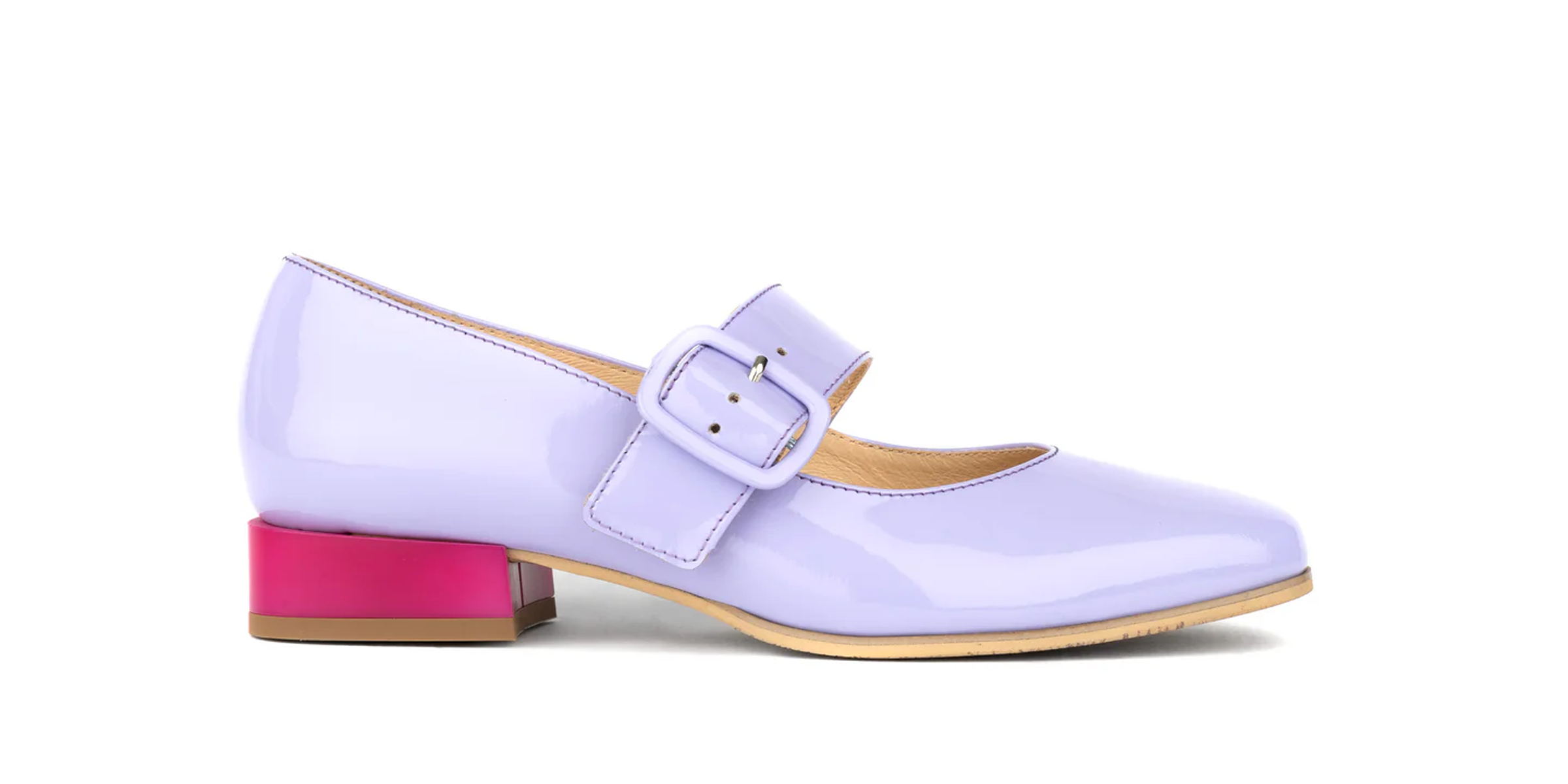 Your favourite Mary Jane returns for a new season. Iconic colourways return, joined by a fresh arrival: patent lavender leather, finished with a raspberry-pink block heel.