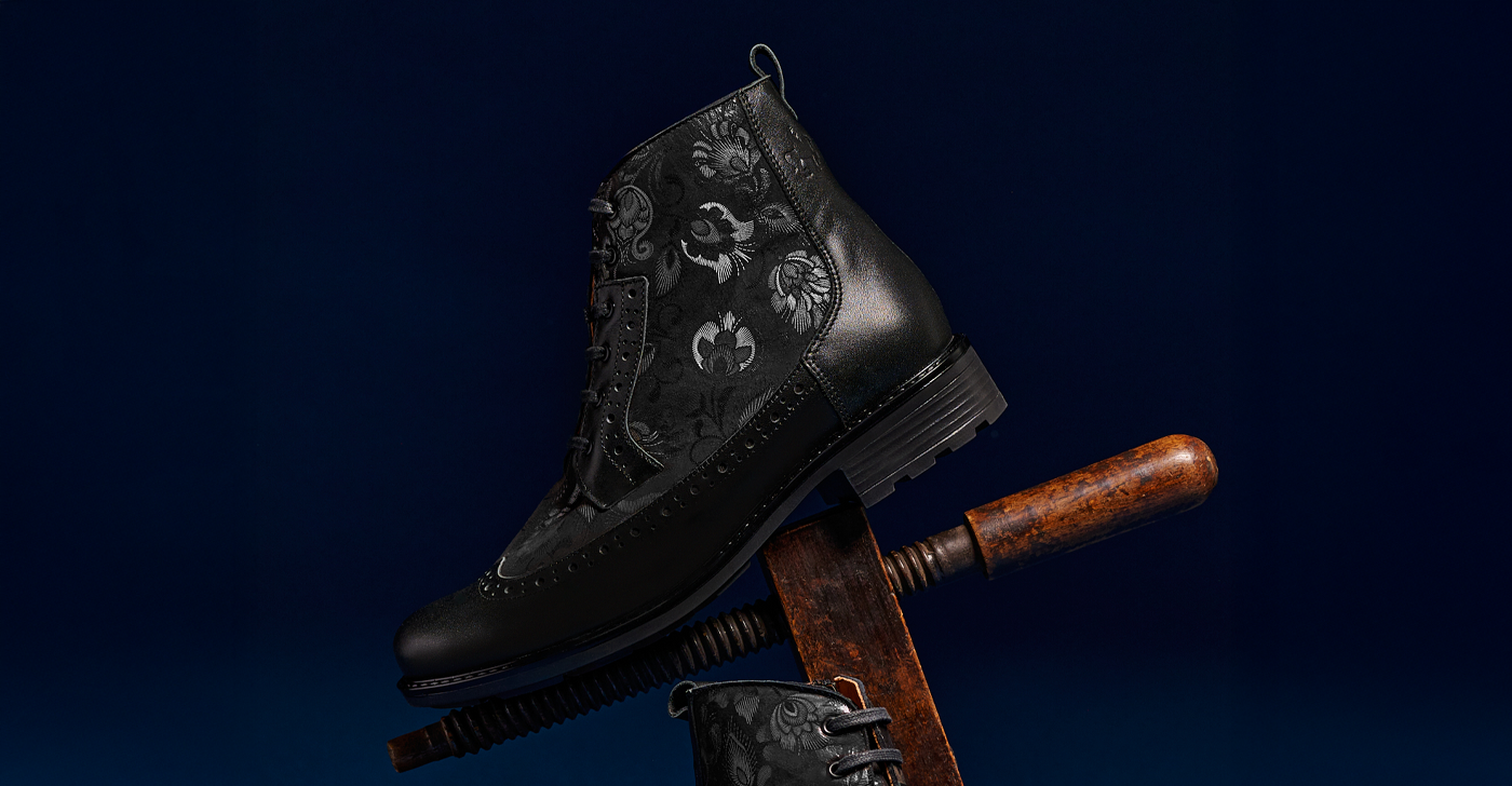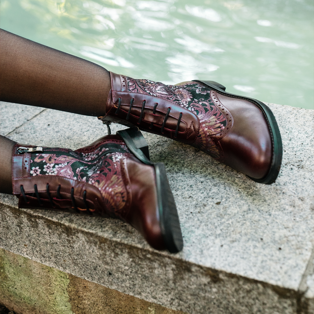 Women's Leather Ankle Lace-up Boot with bronze floral details